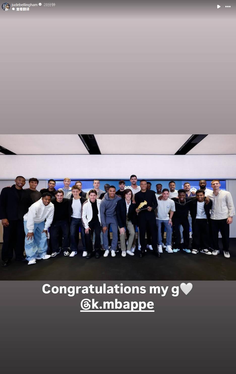 贝林厄姆在社交媒体上晒出了全队与姆巴佩的合照,并配文:“恭喜你,兄弟”,并配上了一个白色的爱心表情。